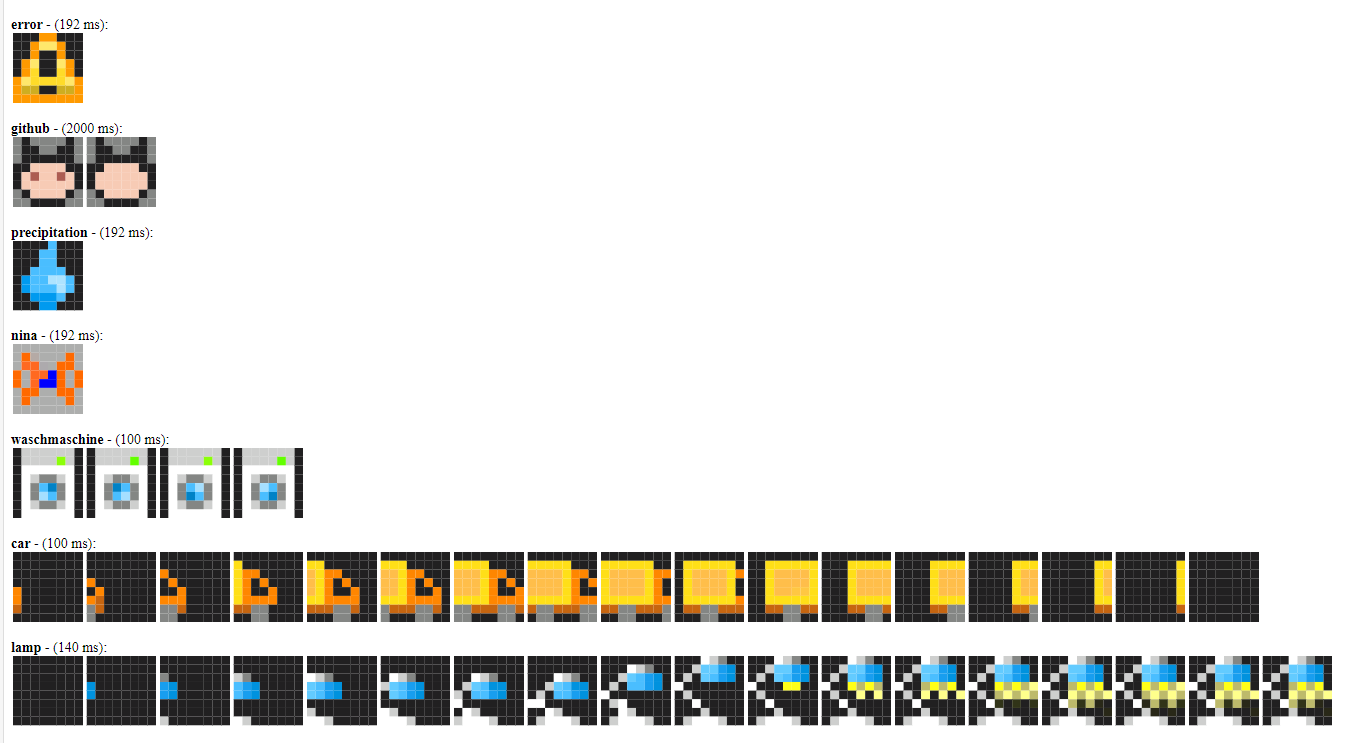 Based on a 8x32 RGB matrix, it displays a clock, the date and up to 24 other 'screens' provided by Home Assistant. Each screen (value/text) can be associated with a 8x8 bit RGB icon or GIF animation (see installation. The values/text can be updated or deleted from the display queue. Each screen has a lifetime, if not refreshed in its lifetime, it will disappear. Even 8x32 GIF animations are possible. You can control nearly everything of the component.