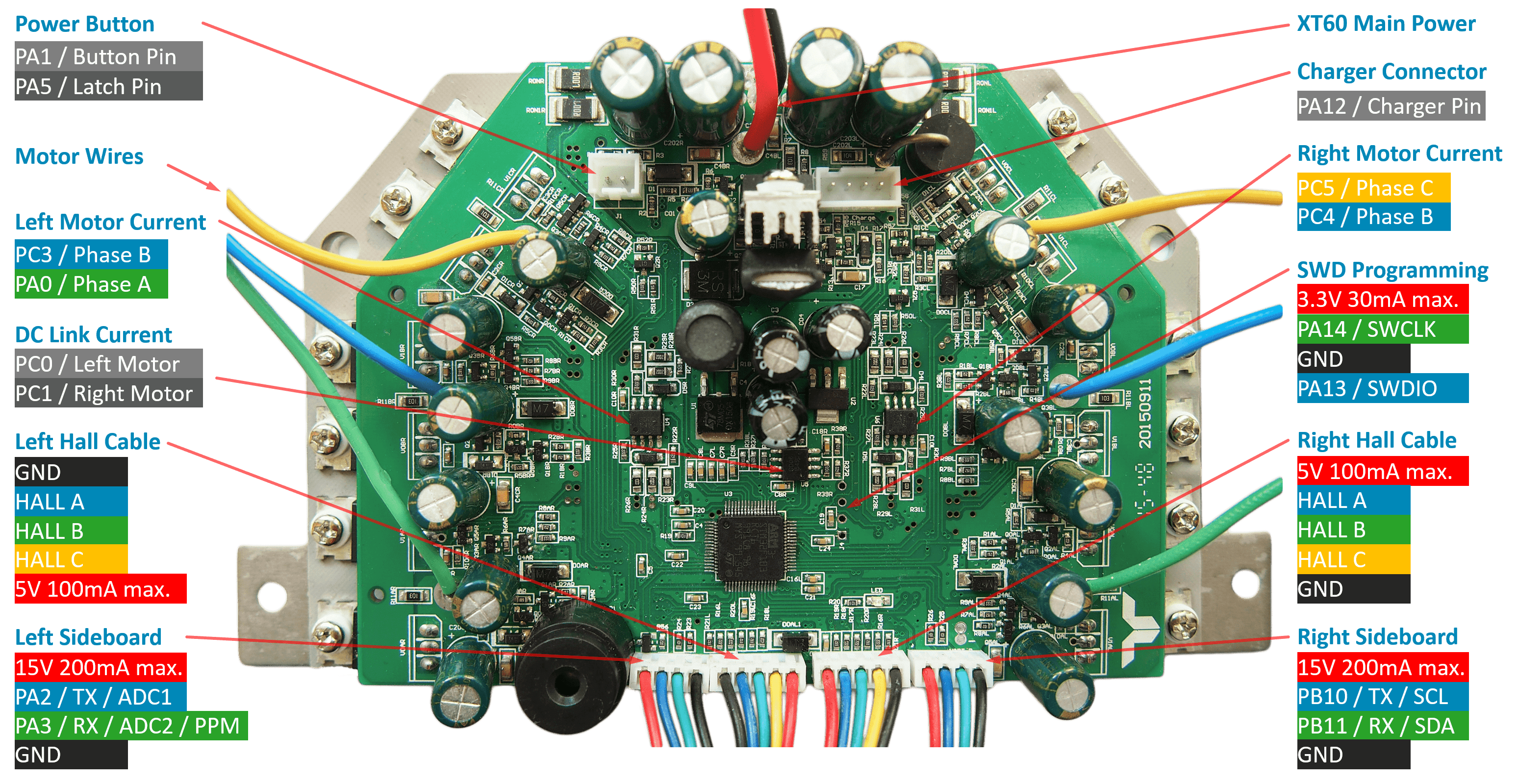 The original Hardware supports two 4-pin cables that originally were connected to the two sensor boards. They break out GND, 12/15V and USART2&3 of the Hoverboard mainboard. Both USART2 & 3 can be used for UART and I2C, PA2&3 can be used as 12bit ADCs.