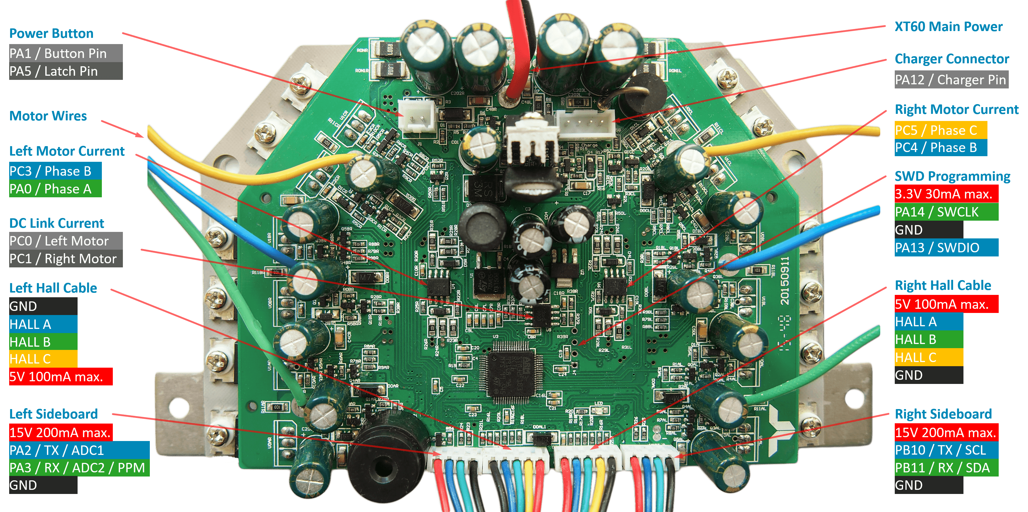 The original Hardware supports two 4-pin cables that originally were connected to the two sensor boards. They break out GND, 12/15V and USART2&3 of the Hoverboard mainboard. Both USART2 & 3 can be used for UART and I2C, PA2&3 can be used as 12bit ADCs.